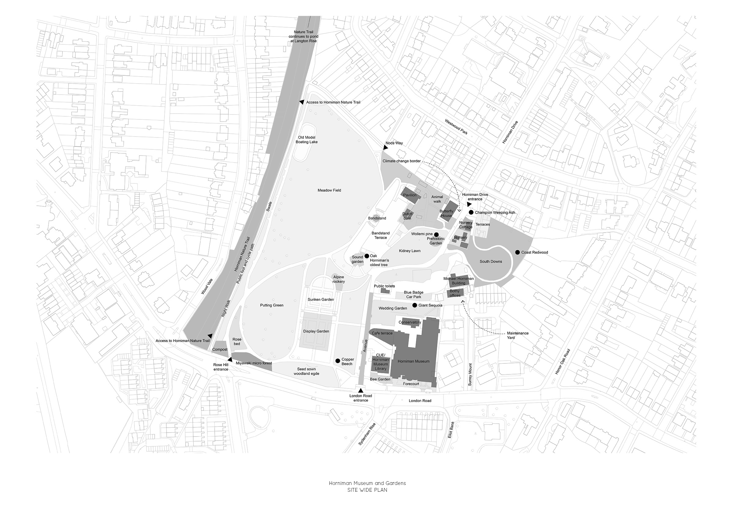 The Nature + Love project for the Horniman Museum and Gardens in South London will transform previously underused areas of the estate into new destinations to enable the Horniman to meet its most important objectives to become more inclusive, and to place environmental sustainability and a commitment to fighting the climate and biodiversity emergencies at the heart of its programming. The design scheme enhances the existing estate with new visitor attractions whilst helping the Horniman achieve the objectives outlined in its Climate and Ecology Manifesto, of reducing greenhouse gas emissions, pollution and waste and increasing biodiversity by 2030, and becoming greenhouse gas neutral by 2040.