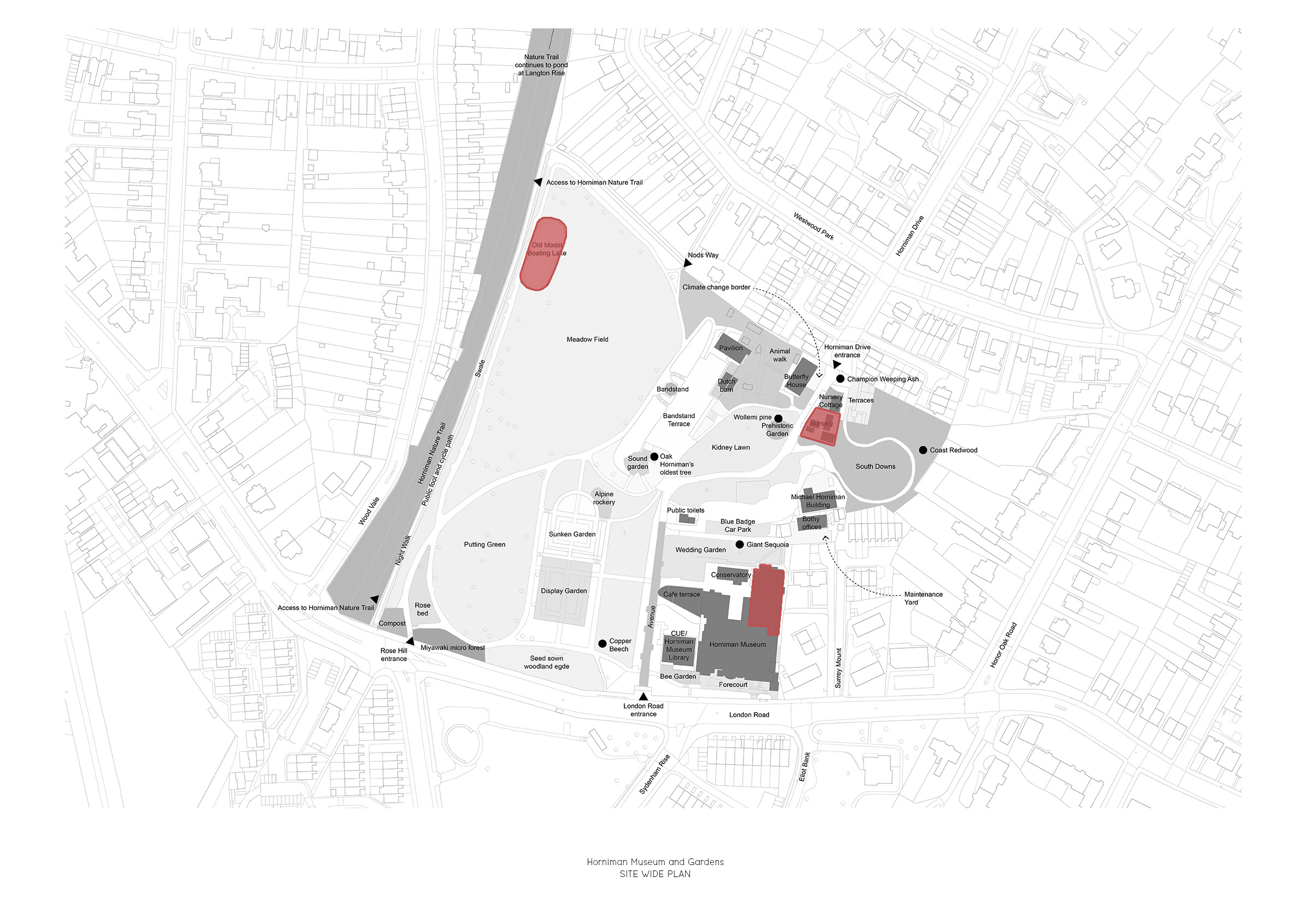 The Nature + Love project for the Horniman Museum and Gardens in South London transforms previously underused areas of the estate into new destinations to enable the Horniman Museum to meet its most important objectives: to become more inclusive, to place a commitment to fighting the climate and biodiversity emergencies at the heart of its programming, and to embody best practice in relation to environmental sustainability.
